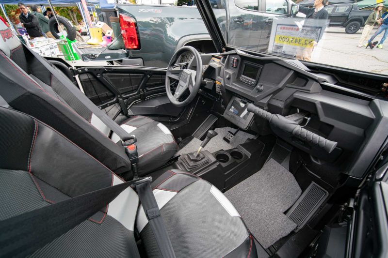 一応定員は2人のようで車内はいたって普通。でもよく見ると車内も全て防水仕様に仕上げられているようですね。助手席前方にハンドルグリップが付いているところを見ると相当アグレッシブな走りを前提としていることが伺えます。走破性は高そうですが荷物は積めるのか? という庶民的な疑問は残ります。やはり実用性よりもアドベンチャー感を楽しむ車なんでしょうかね。