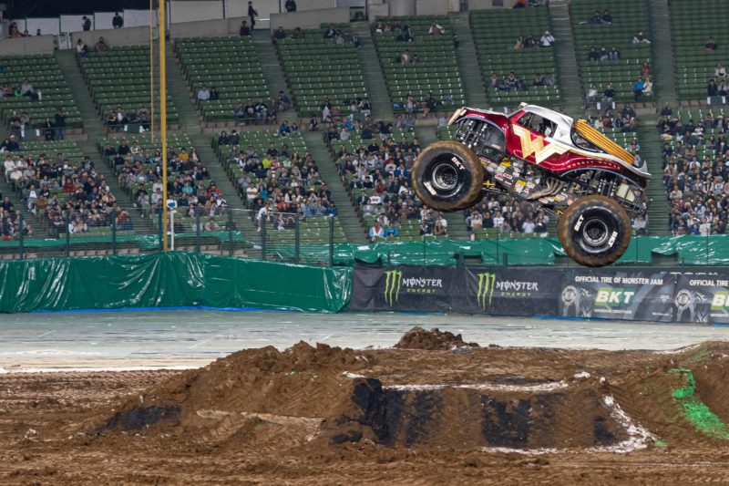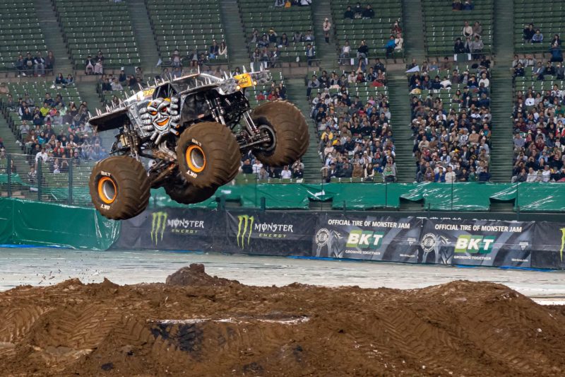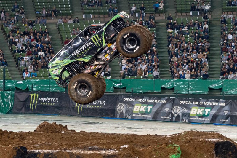 全長5メートル超、重さ5トンの重量物がこんなふうに宙を舞います。これが1,500馬力の底力というものでしょうか、スペースの関係から助走なんて大してつけられないんですけどね、そもそもモンスタートラックのミッションはローとハイの2速だと聞きましたし。