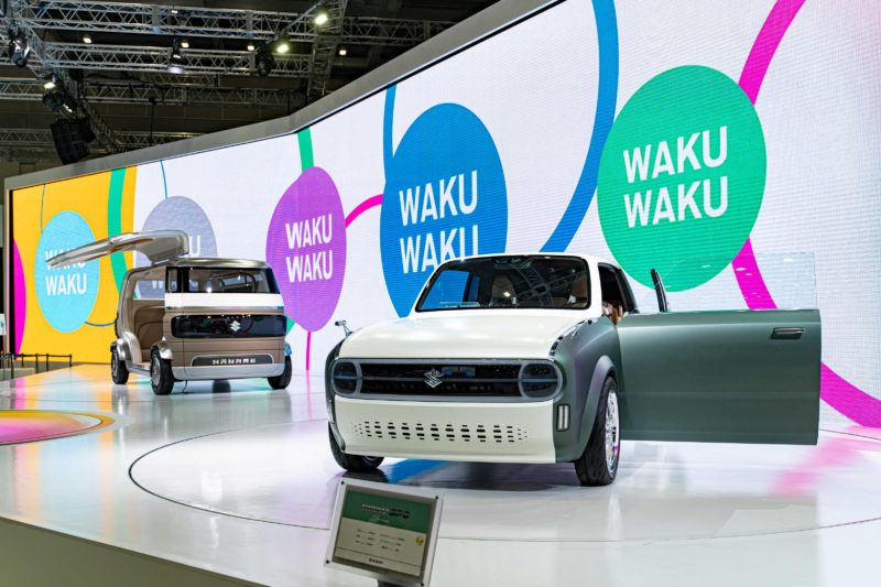 こちらはHANAREと呼ばれるワンボックスカー。走るリビングルームみたいなコンセプトでしょうか? でも決して高級思考ではなくもっと広い使い道で考えられているようで、昨今はアウトドアブームで企業がキャンピングカーを使って大自然の中で仕事をしたりする時代。この車は未来のアウトドアスタイルを見据えたスズキの新たな提案なんでしょうね。