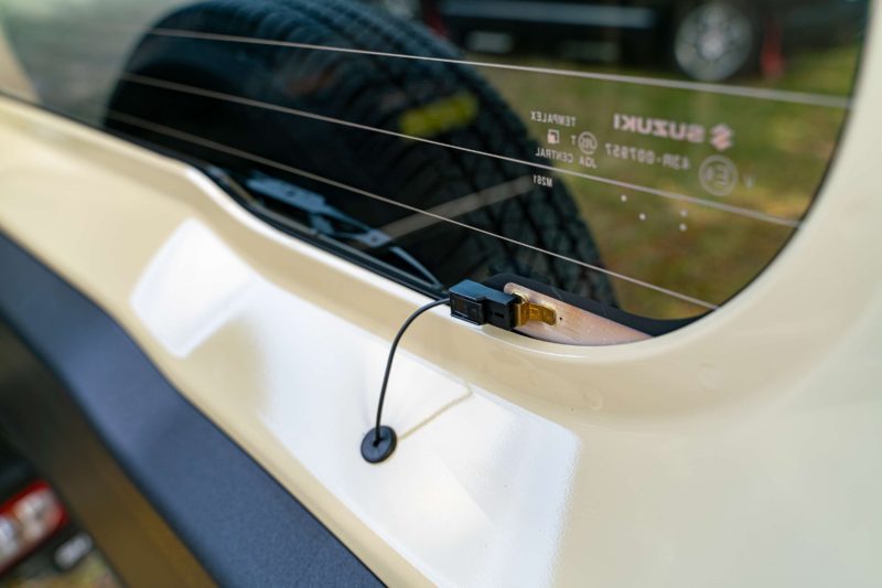 ジムニーのリアガラスの熱線導入線はコストの関係なのか配線がむき出しです。こういうところがスズキクオリティ! ジープラングラーなども同様らしいので4駆特有なんでしょうか...。