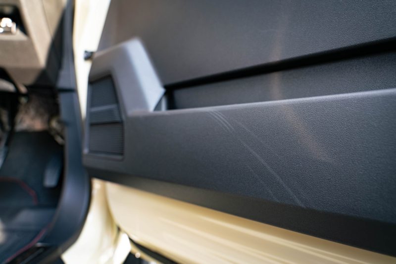 しかしこの樹脂パーツはとても傷がつきやすく擦り傷などに気を使います。乗降時に靴が当たる事でドアポケットはご覧の通りですし、車中泊時に助手席足元に荷物を押し込む関係でグローブボックスにも。