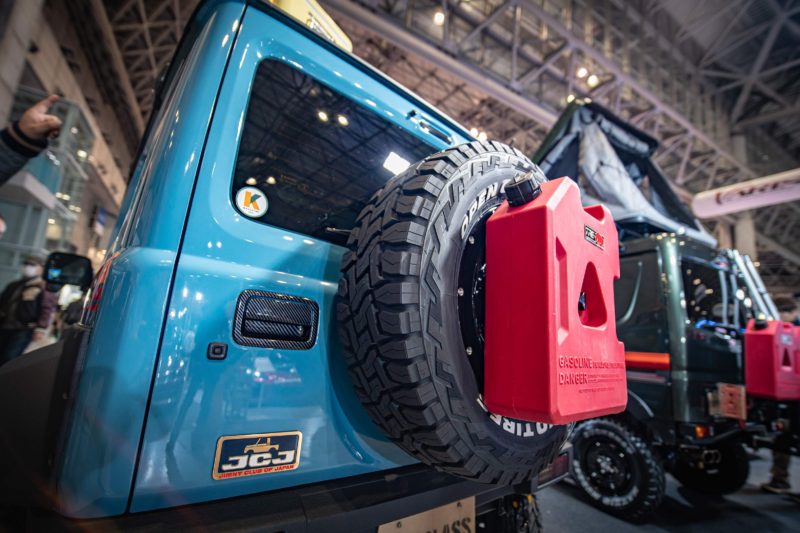 スペアタイヤに取り付けられた遂行缶のようなタンク。金属ではないためガソリンは入れられないそうなので水を入れるのが目的かもしれませんが、どちらかというとドレスアップパーツ的な存在でしょうかね。カッコいいですが実用性はそこまでなさそうな気がします。水を入れていた場合は太陽光で温度が上昇し傷みやすいでしょうし、入れっぱなしでは苔も生えそうな気がします。