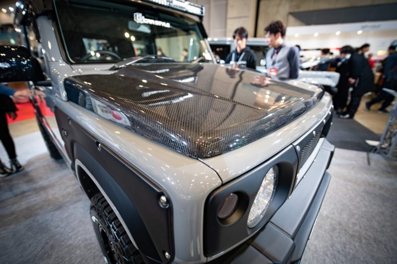 カスタムカーの祭典では何ら珍しくありませんが新型ジムニー用としてはまだそれほど選択肢の無いカーボンボンネット。ジムニーの標準ボンネットは時に両手で支える必要があるくらい重いですからこのパーツの存在価値はかなりのものでしょうね。ドライカーボンでなくウェットでも十分軽そうです。