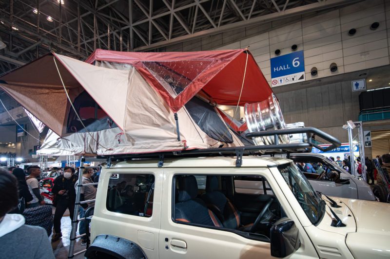 T-STYLEさんブースにはジムニー顔のエブリィとジムニーが2台並べて展示されておりました。いずれもルーフテントを広げアウトドアを意識したカスタム。