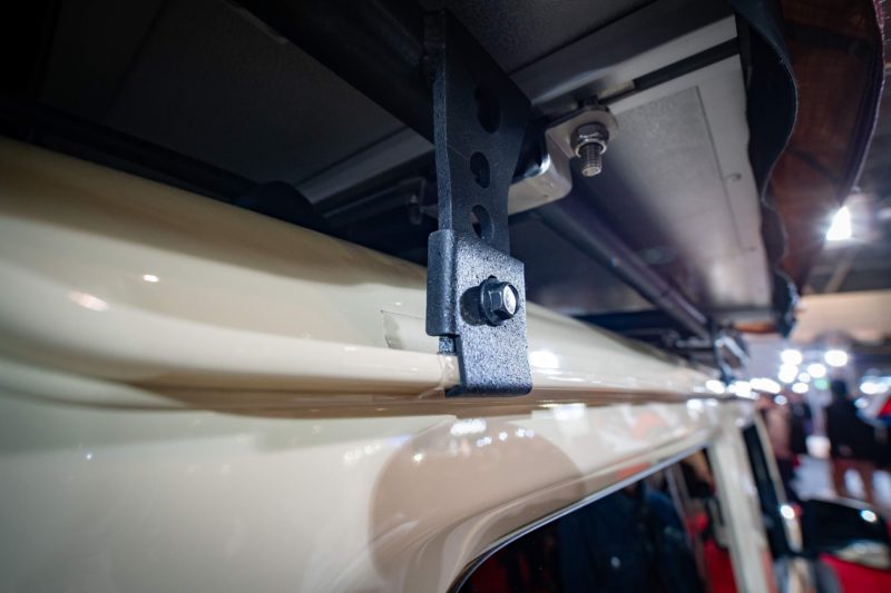 このルーフテントは車両後方にはみ出して組み上げた分、前方に出来たスペースをバルコニーのように利用している点が特徴。バルコニー部分に人が乗っても強度的に大丈夫なのかは不明ですが、例えばポータブルバッテリー充電用のソーラーパネルを広げておくスペースなどには有効活用できそうです。水タンクを載せておくなんて使い方も良いかもしれませんね。