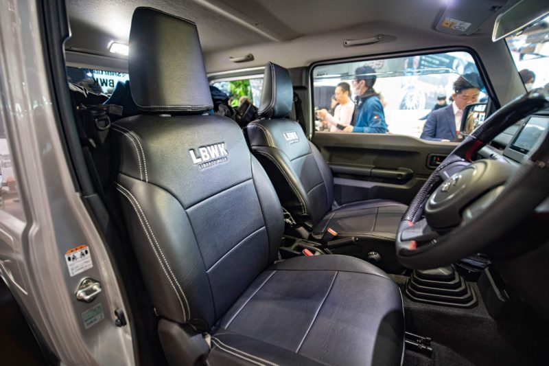 ジャッキアップの動作に皆が注目する中、私が見ていたのは内装のほう。このシートカバー、なかなか作りが良さそうじゃないですか。レザーにせよ合皮にせよ、伸縮性の観点で言えばテキスタイルなどより劣るはずですからシート形状へのフィッティングが難しいはずですが、このカバーはどこにもシワが寄ることもなくジャストフィット。とても馴染んでいる感じがして好感が持てますね。運転席側のヘッドレストが前後逆に付いているのはご愛嬌でしょうか。