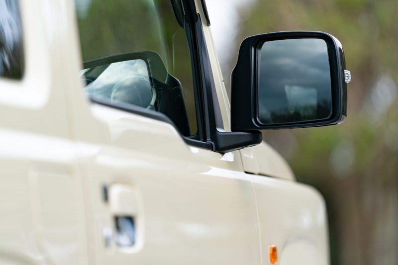 ジムニーのドアミラー、比較的大きくて見やすいと思います。ブラックルーフとのコーディネートなのか黒いミラーなので締まって見えますがボディに比べて塗装は薄いような気がします...。
