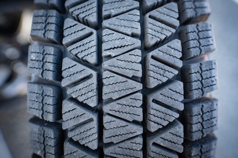 こちらが冬季使用していたブリジストンのスタッドレスタイヤ。ゴムの表面を見ると細かな穴が開いておりいうならばスポンジのような素材に見えます。これがブリジストンが謳うアクティブ発泡ゴムというやつですか。指で触ってみても確かに柔らかく路面を捉える感じが分かります。乗り心地も普通タイヤよりも柔らかいですね。その代わりこの素材は減りが早そうです。