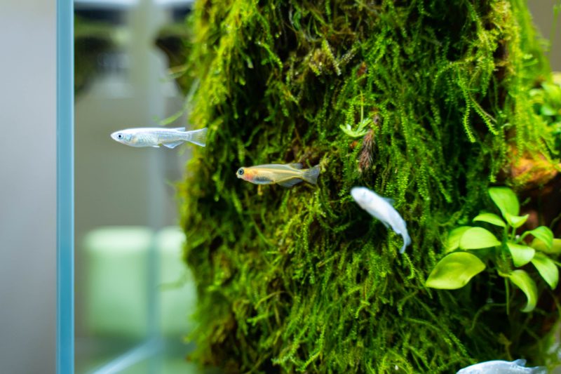 自宅の部屋の片隅にメダカ水槽を立ち上げました。立ち上げたと言ったら大袈裟ですが、以前より育てていたテラベース(苔むした古い切り株みたいなテラ)をあえて水没させそのまま水中葉に切り替えただけです。テラベースに活着させていたのはクリスマスモスとアヌビアスナナプチなので、いずれも水上・水中どちらの環境でも生きて行ける強い植物なのです。