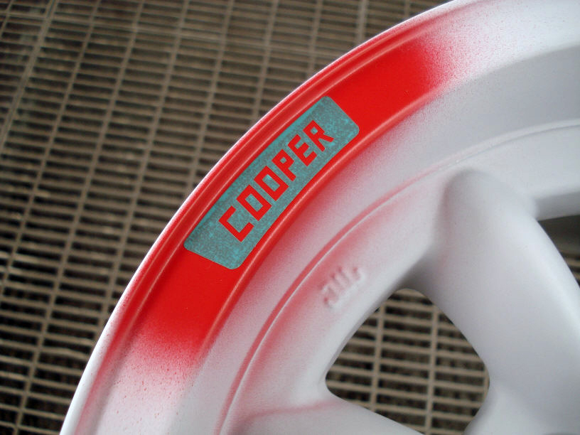 さてここで真っ白なホイールに突如として真っ赤なペイントが施され、この画だけ見るとレーシングカーのホイールみたい!なんだかこのままでもカッコイイような...。しかし私は今回の塗装作業の中で一番驚いた工程がここです。確かにホイールの一部には赤地に白文字でCOOPERロゴを入れる段取りでしたが、それはホイール全体をチャコールブラックに塗ってからだとばかり思っていました。ここが塗装屋さんの経験からなるテクニックなんですね。隠蔽性と呼ぶそうですが、暗いベース色に対して明るいペイントを重ねると、ベースの色が上物のカラーに影響してしまい本来の明るさが再現しづらいのだそうです。確かに遠い昔、学校の美術の時間に色を塗る時は明るい色から...と言われた記憶がありますが、多分それです。でもプロの話はこれに留まりませんでした。明るい色を無理に再現しようとすればどうしても上塗りの層が厚くなり、後にマスキングテープを剥がす際、そのエッジがガタガタになってしまうため美しく仕上がらないのだとか...。もはや、ほーなるほどーという感想しか出てきません。
