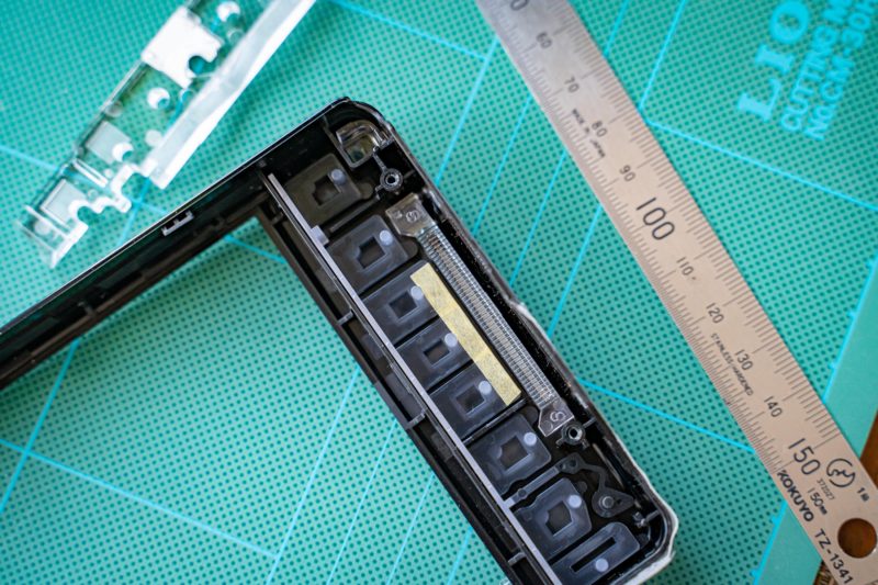 勿論使用するテープに透明のものを用いればさほど影響はなさそうですが、その場合はテープの材質がナイロンやセロファン系となり、ボタンを押した時のクリック感に違和感が出たり素材特有の音が出そうでしたから、今回はなんとしても紙のテープを使いたかったのです。