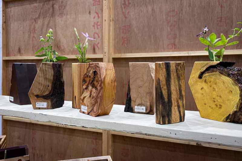 同じブースに並んでいたティートレイ。木目が美しいだけでなく異なる種類の素材を十字に埋め込んだラインが非常に魅力的で目を奪われた作品。自宅で日常的に使うにはかしこまりすぎている気がするし、キャンプなどに持っていくには勿体ない、欲しいけれどすぐには使い道が浮かばない、いや、ウッディーな一輪挿しと陶器に植えた苔玉を並べて置くにはちょうど良いか?