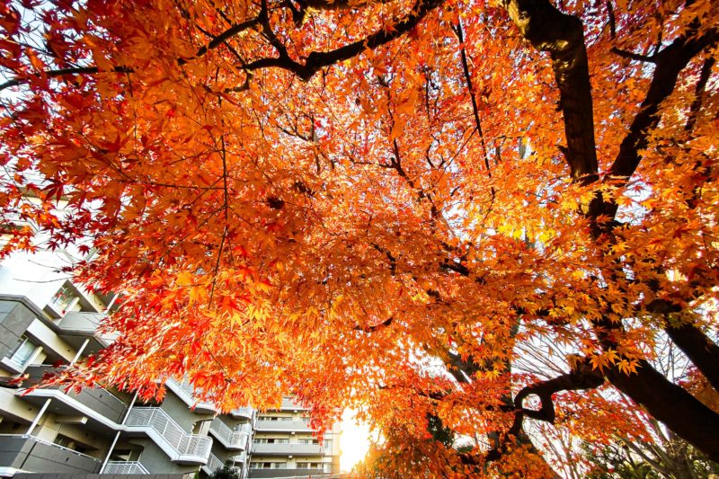 自宅近所でモミジが夕日を浴びて輝いていました。東京で秋に色づく木というとイチョウが一番多い気がしますが、公園やマンションの一角、お金持ちの庭には時々こうしたモミジの木を見かけますね。