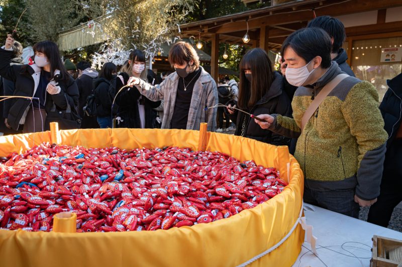 氷川神社に来たらぜったいにやってみたいと思っていたのがこの ”安鯛みくじ”。鯛の形をしたおみくじを釣り竿で自ら釣り上げて運気を試すというユニークなチャレンジ。なんと言ってもこの沢山の鯛がおめでたい感じがして良いじゃないですか!