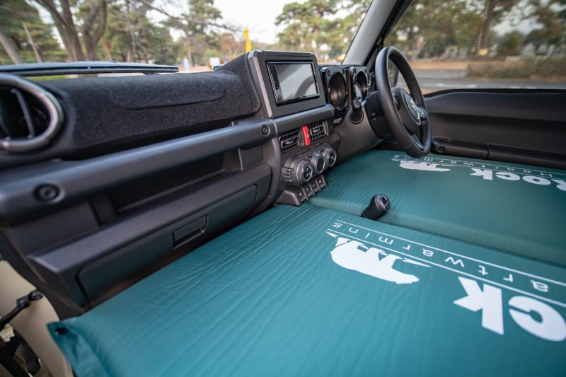 フロント側先端はこんな感じでピッタリフィットします。Fit Keeperにはウレタンがこの8cmモデルの他に10cmモデルもあるようですが、ジムニーの場合には8cmがギリギリですね。10cmだと恐らくこのあたりのフィッティングが悪くなりそうです。その代わりと言ってはなんですが、ぴょこんと飛び出したマニュアルシフトのレバーがもう少し埋まる感じになるでしょうから、車中泊時の寝返りで足がゴリゴリする可能性は減りそうです。
