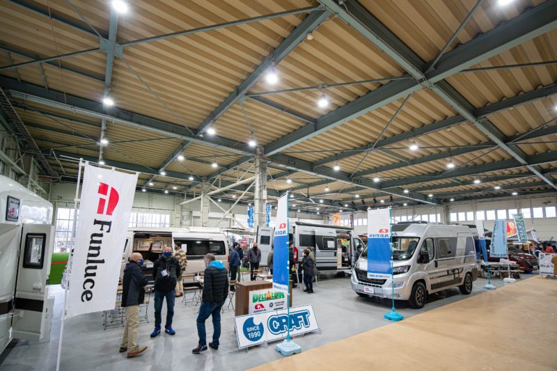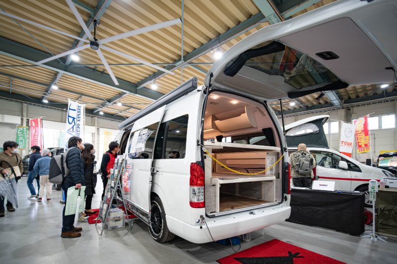 東京ビッグサイトのような広大な敷地!とまではいきませんが、屋内展示場と屋外展示場の両方に所狭しと並んだキャンピングカー。雨天という天候が影響してかお客さんは屋内展示場に集中しておりました。屋外はトラックをベースとした大きめな車、屋内はハイエースより小さい車が並び、市販車ベースでキャンピングカーへのカスタマイズを得意とするメーカーがこれ見よがしにデモカーをアピール。