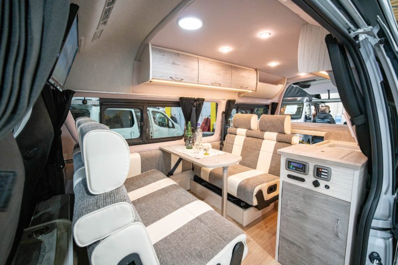その昔 ”ハイエース” と聞くと ”商業車” というイメージが強かった気がしますが今は自家用として人気がありますし、それをベースにキャンピングカーとしてカスタマイズすればご覧のようなラグジュアリー空間に生まれ変わります。色合いが明るいためかすごくお洒落に見えますね。