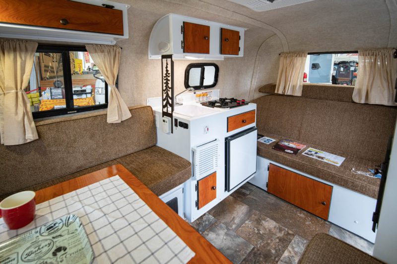 トレーラー内は結構豪華な作りになっており4人家族くらいが十分寛げる空間。一般的なキャンピングカーと違いトレーラーの場合、走行に対する考慮をほぼしなくて良いのでシートアレンジ一つにしても車としての機能より居住スペースを優先で考えられるため自由度が高いですよね。シートベルトとか不要でしょうし。