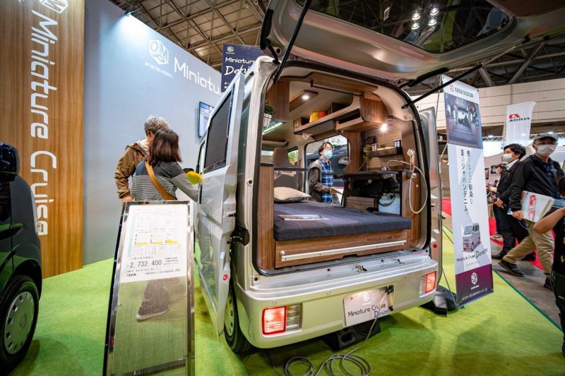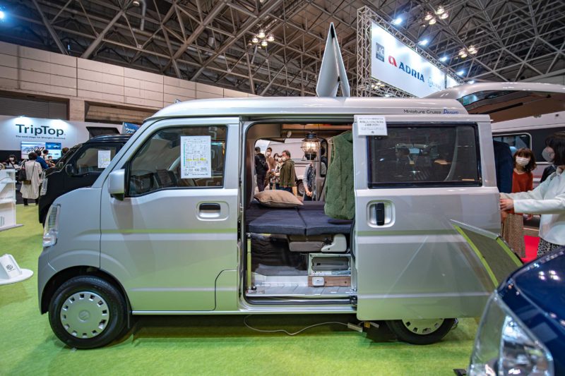 今回のイベントで一番気に入ったのがこちら ”岡モータース” さんブース。香川県にある軽キャンパー専門メーカーで、会場にはミニチュアクルーズブランドで展開する合計4台のスズキ・エブリィをベースとしたキャンピングカーが展示されていました。