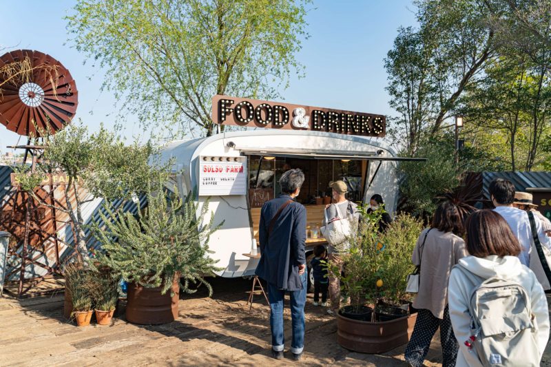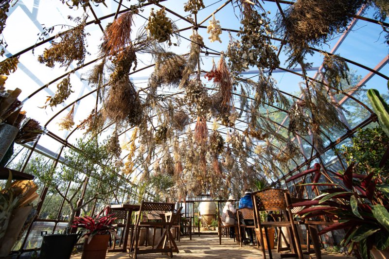 以前は敷地の中央付近にキッチンカーがあってちょっとした軽食やかき氷などを売っていましたが、今年はエリア内にカフェスペースが作られていて、ビニールハウスの骨組みを利用して大量のドライフラワーが飾られていました。これはなかなか圧巻ですね。