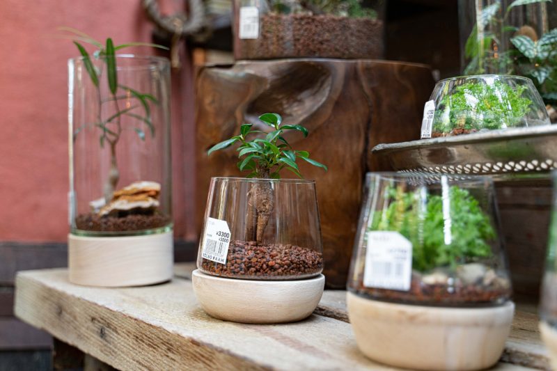 お馴染みのガジュマルもこんな風にガラス容器に植え付けるだけで上品に見えますね。こちらも購入するより作った方が安いのでアイデアだけ参考にさせて頂きます。