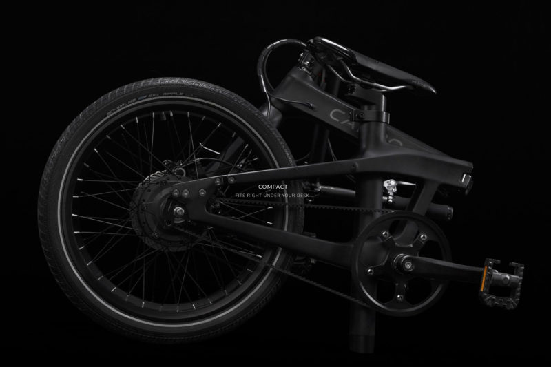 フレームはカーボンでブレーキはディスク。電動アシストなのに13kgと軽量な仕上がり。65kmというバッテリーライフはいまどきとしてはインパクトに欠けますが、折りたたみ自転車という枠で考えれば十分かも知れません。