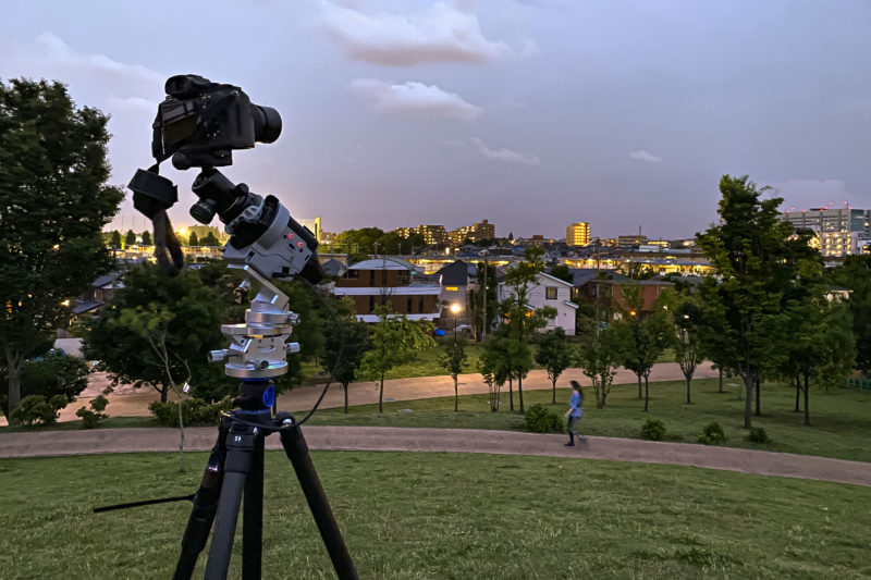 いやぁ本当に残念です。赤道儀まで持ち出したのは望遠レンズと長秒間露光によるノイズレスなお月様が写したかったからで、簡単なように見えてこのセットを組み上げるだけで20〜30分くらい掛かるんです。特に今日のように明るいうちからセッティングをしなければならない場合は北極星の位置が確認できないため赤道儀の回転軸となる極軸をコンパスを使って導き出さなければならずちょっと大変なんですよね。