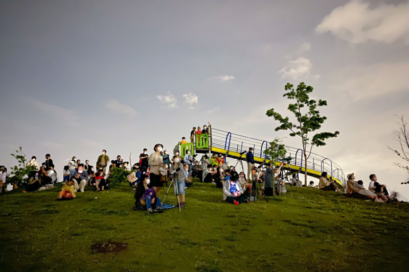 大人だけでなく子供やワンちゃんまで集まっていましたが、流石に子供は変化のない空に飽きたのか巨大すべり台で遊んでおりました。私は2時間粘って諦めましたが皆さんはその後もずっとここでまだかまだかとその時を待っていたのではないでしょうか?