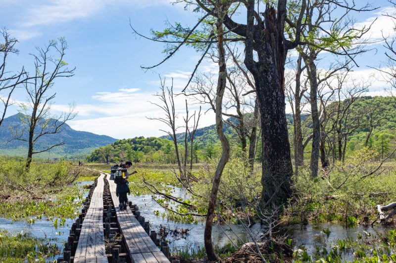 湿地帯のトレッキングというと長野県は霧ヶ峰高原にある七島八島を歩いたことがありますが、あちらは湿地帯を周遊するようなコースだったのに対し、尾瀬は湿地帯の中の一本道をひたすら歩く感じ。はじめのうちは牧草地帯のような感じでしたが先に進むにつれ徐々に水がひたひたになってきていかにも湿地帯な感じを味わえます。ただここの水はわずかでも流れがあるので透明度が高く綺麗な水でしたね。