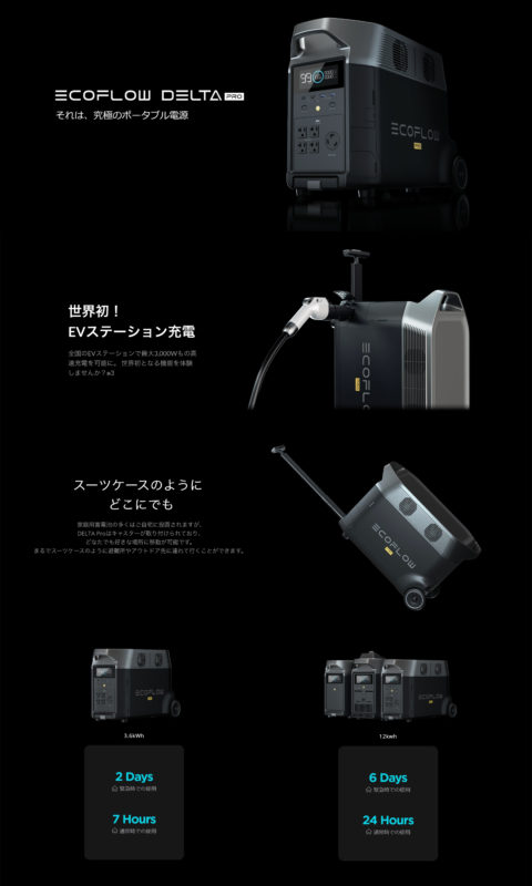 ただこれだけの大容量タイプとなると流石に筐体が大きく重くなりますから片手で持ち歩くのではなくキャリーケースのようにキャスターで転がして移動するようですね。キャンプに使うには少々大げさなサイズ感ですが、自宅の緊急用電源としてなら最高に心強い存在です。なんたって謳い文句は「市販されているほぼすべての家電を複数台、同時に動かすことができます。」ですから。