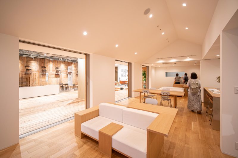 モデルハウスの中は誰でも見学できるようになっています。見るからに無印らしいシンプルでお洒落なデザインに仕上がっていますが、随所に細かな工夫が見て取れるのもこの家ならではです。例えばデッキへと続く窓の構造に注目した場合、一般的な窓ガラスサッシと違って窓枠全てが残ることなくフルオープンになるんですよね。開いた窓は壁の中に隠れてしまうという斬新さ。なるほどさすがの開放感。