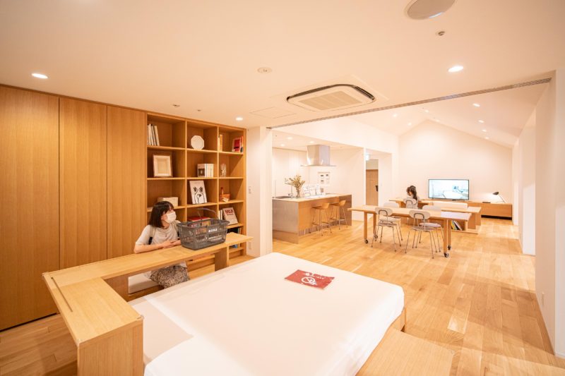 なんだか文句のつけようがないくらいスタイリッシュで機能性に富んだ家ですが、最大の欠点というか特徴は全てが白木で出来ている点ですね。こうして見ている限りは無垢の木のぬくもりが非常に美しいのですが、これはあくまで屋内に造られたモデルルームだからで、実際には雨風にさらされるわけですし強い紫外線が降り注げば白木が黒く劣化していくのは容易に想像出来ます。