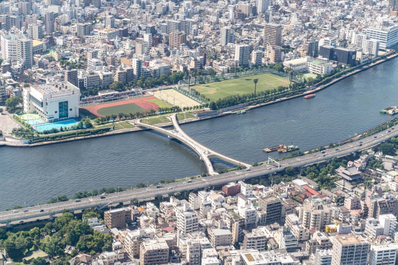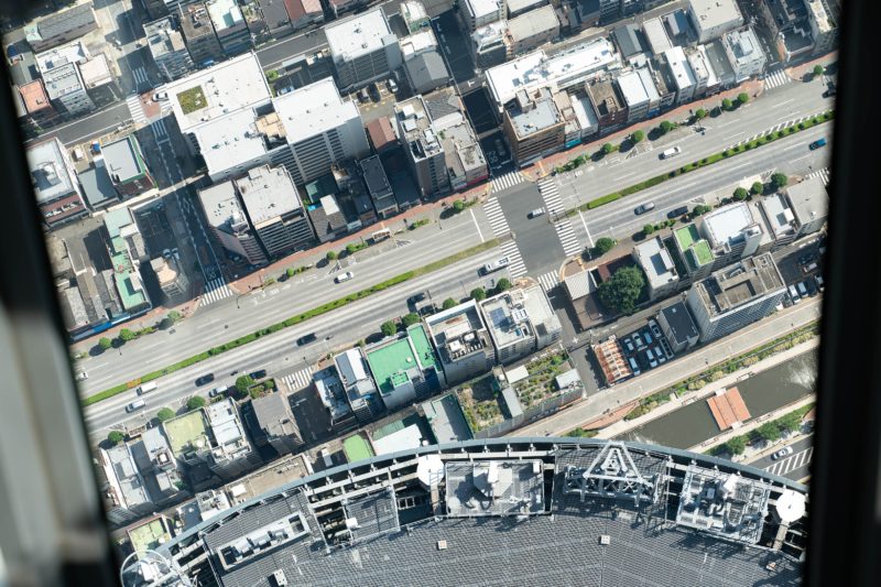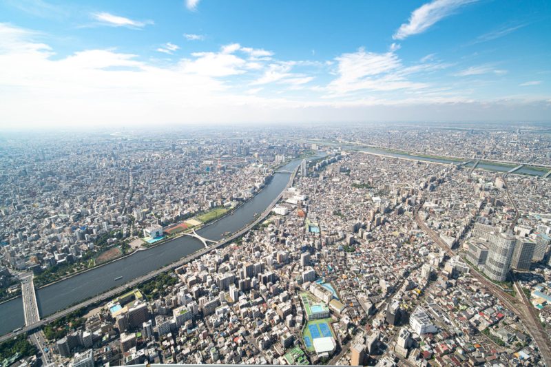 こちらが地上450メートルからの眺め。もはや航空写真ですね。高いとか怖いとかそういう高さを超えているのでスカイダイビングに似た感覚の麻痺があるような気がします。バンジージャンプは怖いけどスカイダイビングはそれほど怖さを感じないのは、もうその高さが目測ではよく分からなくなるからだと思いますが、ここスカイツリーの450メートル展望デッキはそんな感じなんですよね。