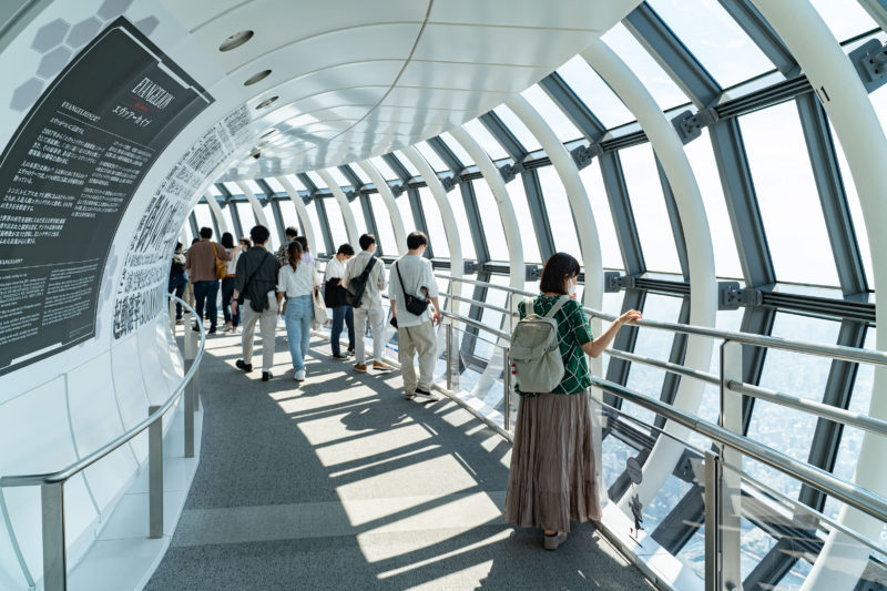 地上450メートルに到着したところ。日本で一番高い展望フロアということになります。この高さに立ってみて初めに感じたこと「足元揺れている気がする!」。いえ絶対揺れていました。
