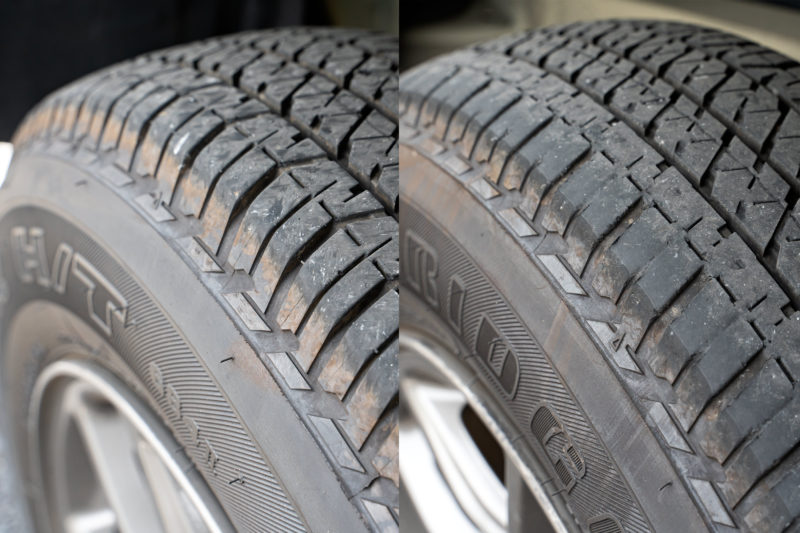 愛車ジムニーに標準装着されているタイヤはBRIDGESTONE DUELER H/T。約25,000km走行の現在はご覧のような消耗具合、左がリアで右がフロント。実際は先日の12ヶ月点検でローテーションしたので前後が逆になっていますけど。