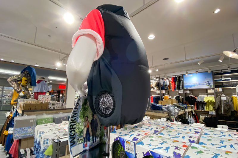 で、店内で試着してみてどれほどの性能か確認したところ、確かに涼しいじゃないですか!。ただ店内はエアコンがキンキンに効いていますからファンで吸い込む空気が十分冷えた空気なんですよね、それが炎天下で気温35℃だったらどれくらい効果があるだろう? という疑問は残ります。