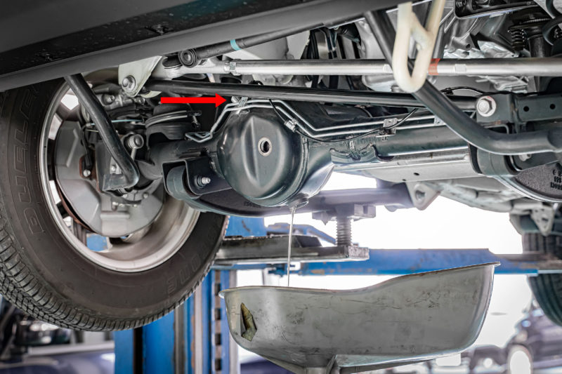 いろんなWEBサイトなどの情報を元に愛車を確認すると、写真の赤矢印の先にあるシルバーの小さなポッチがブリーザーバルブなるものらしい。走行中デフが稼働して熱を持った際、デフ玉内のオイルや空気の膨張により内圧が高まった場合にその圧を大気開放する役割。