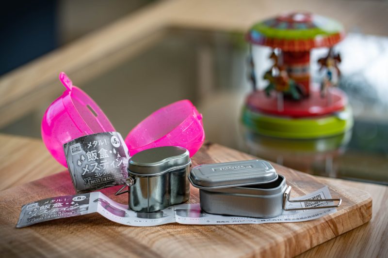 今回はアウトドア用品の飯盒とメスティンのミニチュアがあったので2回チャレンジしてみました。そうしたところ見事飯盒とメスティンそれぞれ1個ずつGET。これなかなか可愛いじゃないですか! まあだからといってご飯が炊けるわけではないんですけどね。