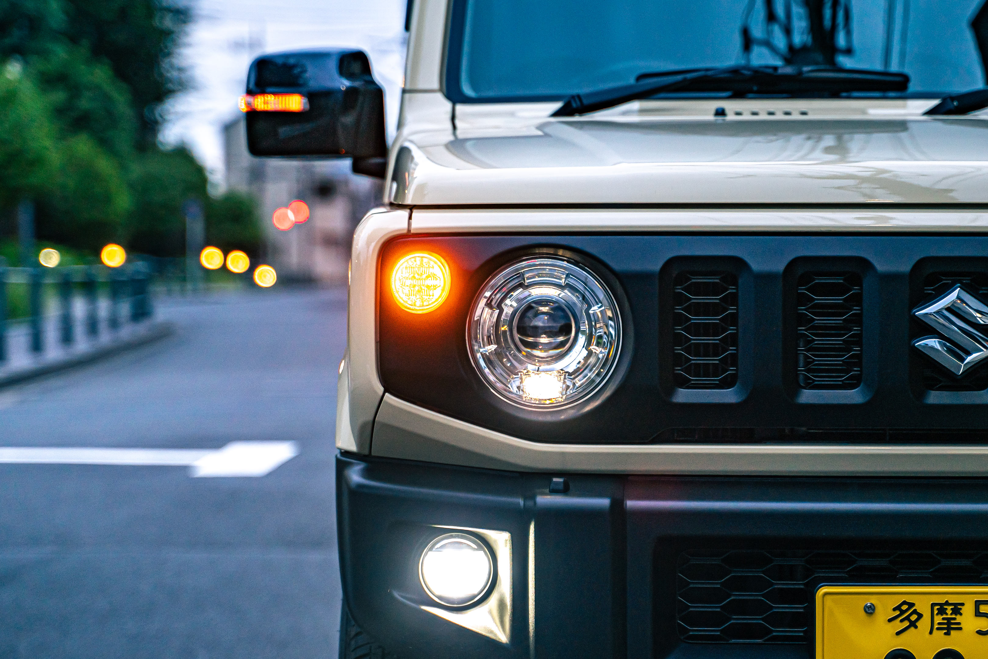 正解はこの写真にあるようにスモールライトの形状と光り方です。スモールライトは夕暮れ時に車幅を知らせるためのポジションライトのことですが、ジムニーの純正LEDライト装備車はプロジェクターライトの丸いレンズのすぐ下に四角い立体形状で光るようデザインされています。そう私が好きなのはこの四角い形状です。電球の形がそのまま露出していないところが実にすっきりしていてカッコいいじゃないですか!