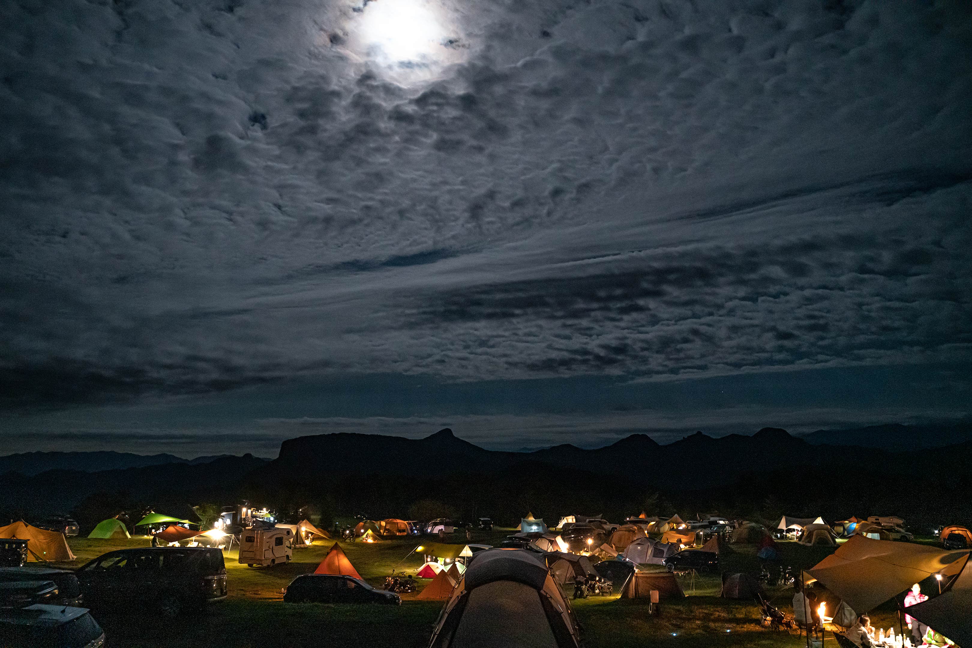 今回はキャンプの夜の雰囲気をお気楽手持ち撮影でパシャっと1枚。三脚を使いませんから写せる明るさに限度はありますが、暗黒の大自然の中に多くのテント明かりが煌々と光っている様子が分かると思います。自然の中で一人でキャンプをするとなると何かと恐怖を感じることもありますが、これだけ沢山の人が同時にキャンプをしているとそういった意味での安心感はありますね。