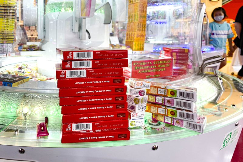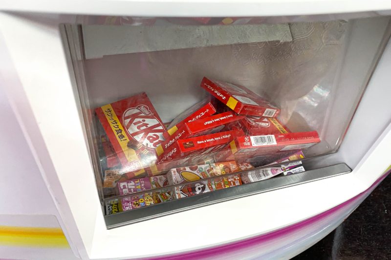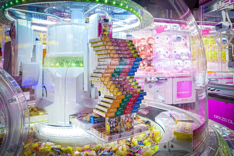 そして今回我々が飛びついたのがこれ。嘘でしょ!っていうくらいお菓子が積み上げられたクレーンゲーム。クレーンはこの山積みお菓子を直接落とすことは出来ず、下でぐるぐる回っている飴玉をスライドテーブルに載せるだけ。テーブル上の山積みお菓子をクレーンで載せた飴玉で押し出し景品取り出し口の穴に落とせれば景品GETというわけ。