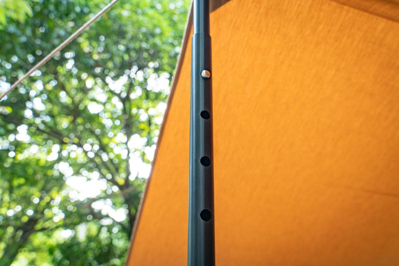 FIELDOOR 6本連結タイプのこのポールは最上段のパイプが約5cm刻みで高さ調節が出来るようになっているため、210〜230cmの間で高の微調整が出来ます。今回ガイロープの長さが足りず中間パイプを1本まるごと外してしまいましたが、もしかするとこの微調整ポールを一番下まで下げればそれだけでも対応できたかもしれませんね。こちらもサブポールとの兼ね合いで今後微妙な高さ調整が求められる際に活躍してくれそうです。