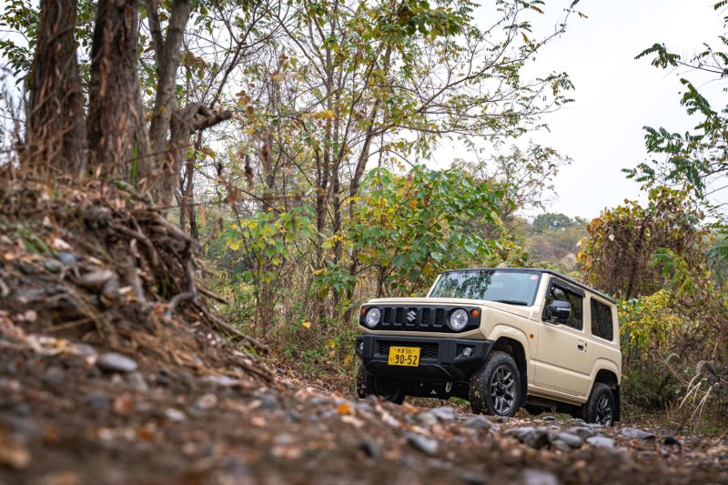 小雨が降り始め路面は滑りやすく変化していましたし、2名乗車+キャンプ用品で車重が重いこともあって流石にここでは4Hではなく4Lで走行。日常的にジムニーが4Lのギアで走らなければならないことって無いんですけどね、究極にトルクが必要な時は戦車のような走破性の4Lにギアを入れます!