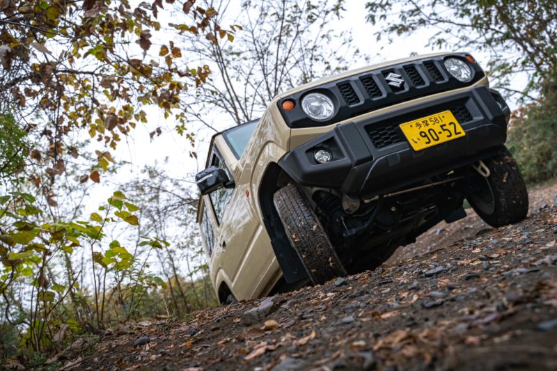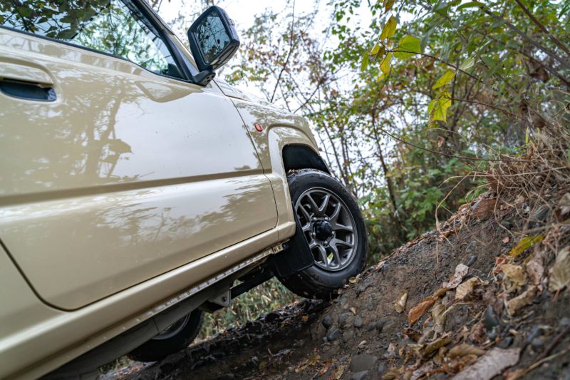 写真で角度を伝えるのは難しいですが、この状態で運転席に乗り込むにはドアの重みに負けないよう片手で頑張って開く必要がありますし、前輪だけが高い位置に乗り上げているので地面からシートまでの高さが広がっていてとても大変です。これでもノーマル車高なんですけどね、リフトアップしているジムニーでこの状態になったらどうやって乗り込むのでしょう?