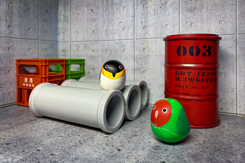 今日も2回ハンドルを回してこれらが出てきました。最近じゃガチャガチャコーナーにテーブルフォトの撮影セットのようなエリアが準備されているので、景品が出てきたらその場で開封してこんなふうに写真を撮ることができます。