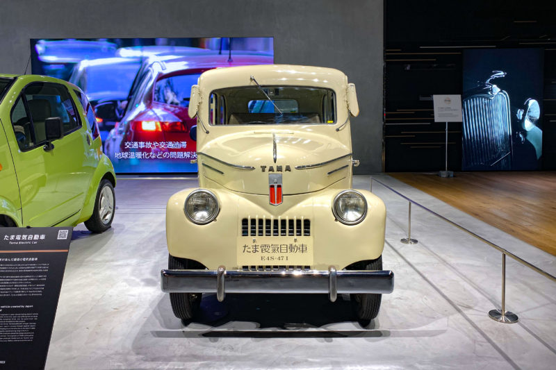 数あるカッコイイ車の中に1台だけ雰囲気の違った車が展示されているのが目に留まりました。こちらは日産の前身となる ”たま電気自動車” 1947年(昭和22年)のE4S-47-Iとう車。驚くじゃないですか、何がってこの時代に電気自動車ですよ!