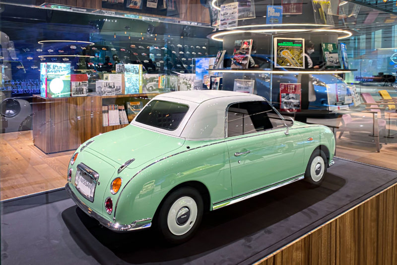 私的にはこれまで日産がリリースしてきた歴代の車の中でこのフィガロが一番好きなモデルです。私が高校生くらいだったと思いますが、マーチのプラットフォームを使ったクラシカルスタイルの3兄弟というのが発売されまして、Be1、フィガロ、パオは数量限定で販売されたのを覚えています。流石にこちらのショールームにも実車は無くこの1/4スケールくらいの模型のみでした。