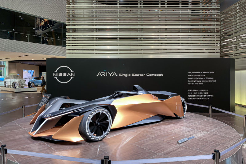 時代は一気に最先端へと飛んで、こちらは現代のレーシングカー、電気自動車のLEAFがベースになっているということで、レース業界もいよいよEVが主流になってきた感じですね。サーキットで走るならやっぱりエンジンの爆音があってこそ迫力を感じられる気もしますが、音だけでなく大気汚染への配慮という点を考えたら当然の流れですね。