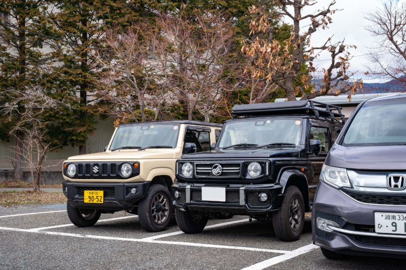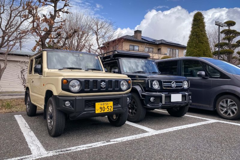 ベンツのGクラスそっくりなジムニー。見たところDAMDのlittle Gドレスアップキットでフルコンプリートってなところですね。オーナーの方が車から降りてきたところを声を掛け写真に撮らせていただきました。