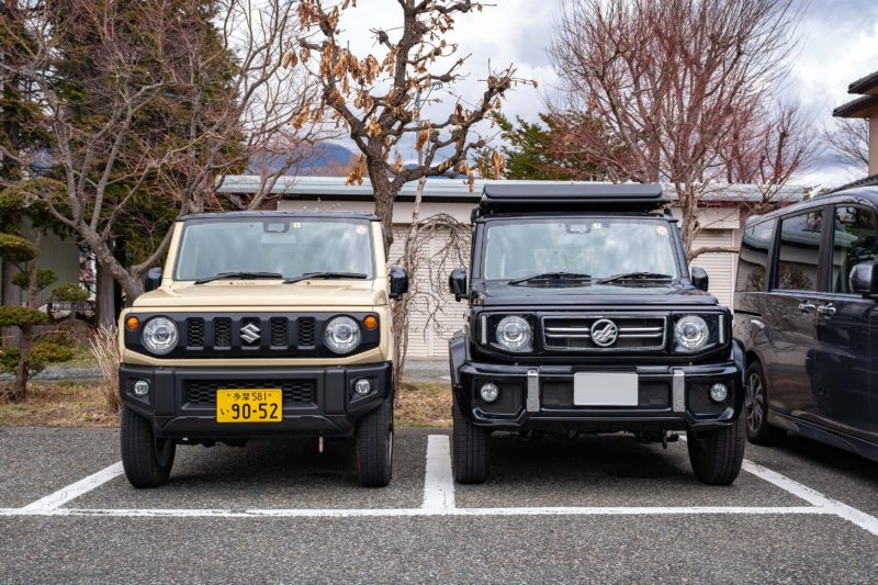 ジムニーシエラなので標準でも大げさに張り出したフェンダーが特徴ですが、こちらのエアロキットはフェンダー形状までもベンツのGを模しているので存在感3割増!なんですよね。こうして並べてしまうと私のノーマルジムニーが随分ちんちくりんに見えてしまいます。私的にはノーマルのスタイリング結構好きなんですけど!